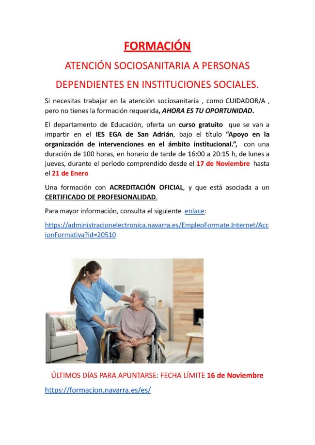 El departamento de Educación, oferta un curso gratuito que se van a impartir en el IES EGA de San Adrián, bajo el título “Apoyo en la organización de intervenciones en el ámbito institucional.”, con una duración de 100 horas, en horario de tarde de 16:00 a 20:15 h, de lunes a jueves, durante el período comprendido desde el 17 de Noviembre hasta el 21 de Enero
