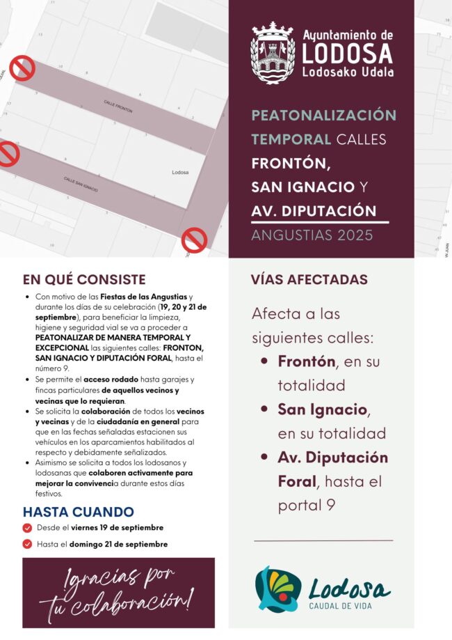 Que con motivo de las Fiestas de las Angustias de esta localidad y durante los días de su celebración (19, 20 y21 de septiembre), para beneficiar la limpieza, higiene y seguridad vial de vecinos y vecinas y visitantes, se va a proceder a PEATONALIZAR DE MANERA TEMPORAL Y EXCEPCIONAL, las CALLES FRONTON, SAN IGNACIO Y DIPUTACIÓN FORAL, hasta el número 9.